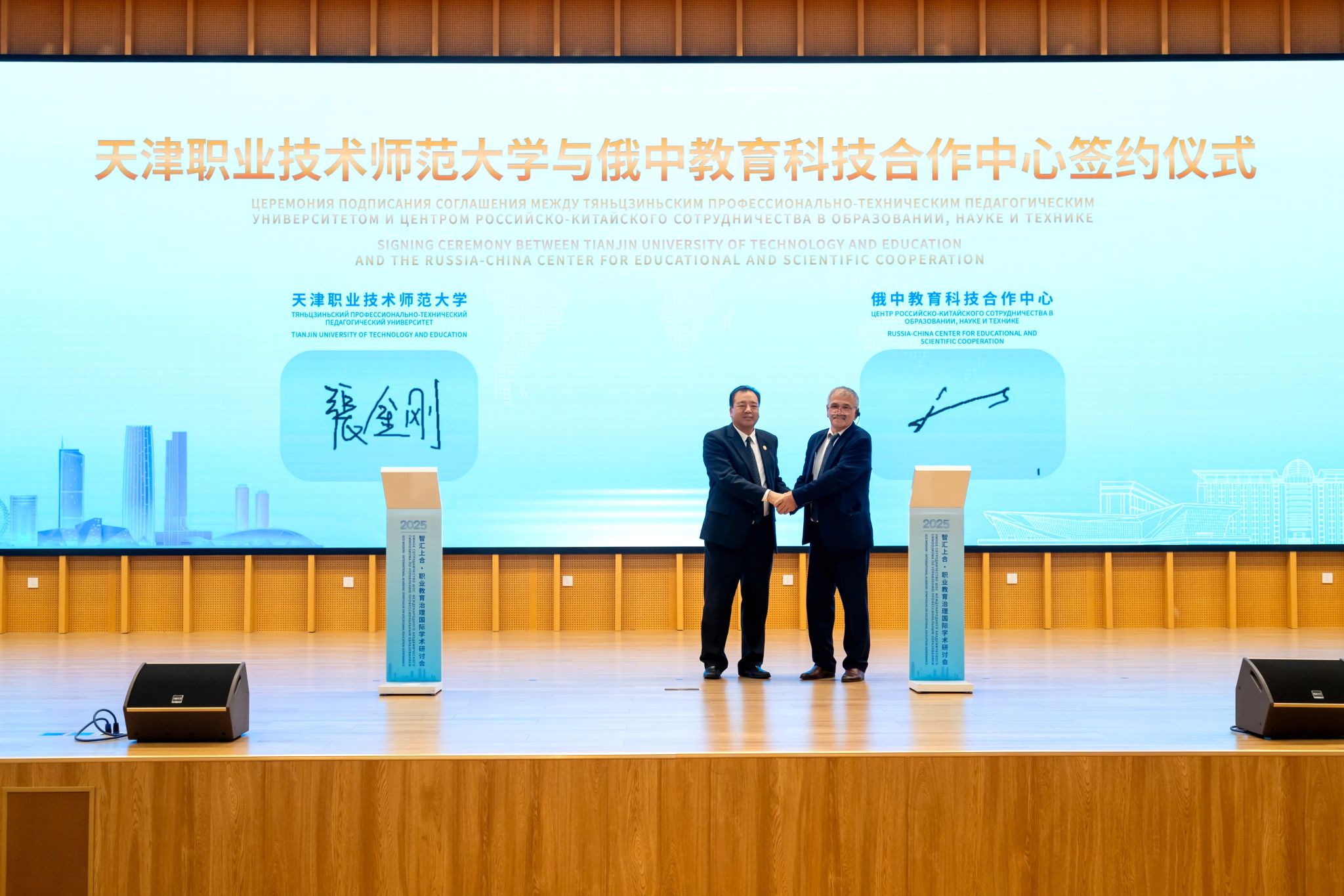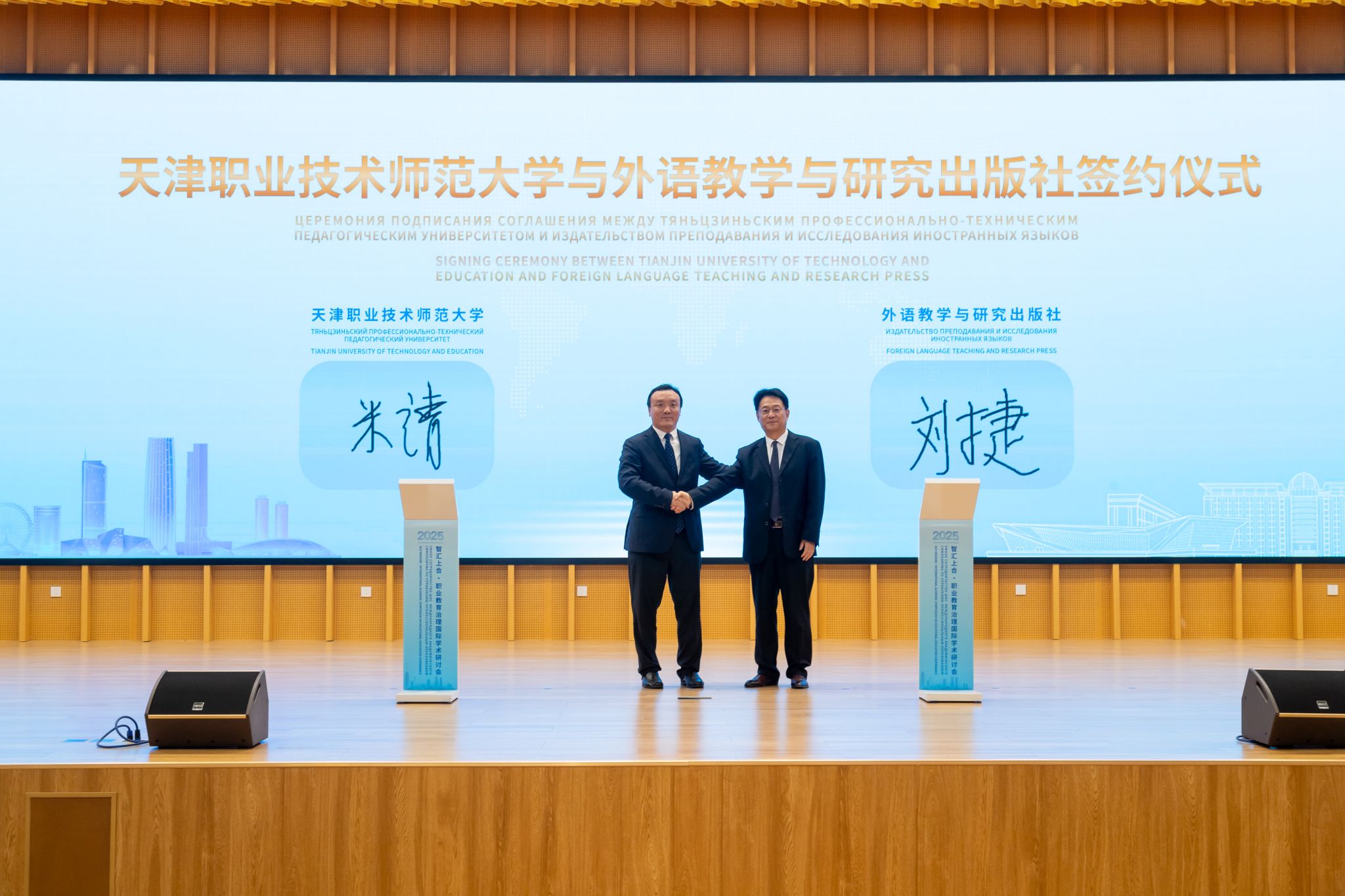 张金刚和塔卡佐夫·瓦列里·赞特米罗维奇分别代表天津职业技术师范大学与俄中教育科技合作中心签署合作备忘录。我校副校长米靖和刘捷分别代表天津职业技术师范大学与外语教学与研究出版社签署合作框架协议。标志着多方在职业教育领域的合作迈出实质性步伐,将为职业教育资源共享、协同发展奠定坚实基础。