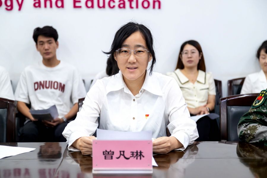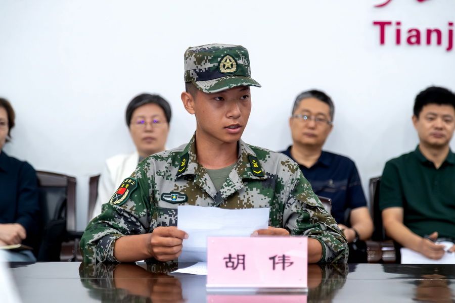 会上,大家集中观看视频资料,重温习近平总书记在纪念大会上的重要讲话精神;党委学生工作部(武装部)部长郝评,电子工程学院党委书记韩树明,校级教书育人楷模、马克思主义学院形势与政策课教研室主任宋瑞璇,校级教学名师、教书育人楷模、最美教师、自动化与电气工程学院教师曾凡琳,中国大学生自强之星、首届“天津最美大学生士兵”、曾服役于中国人民解放军空军军乐团并参加中华人民共和国成立70周年国庆阅兵任务的学生秋思嘉,天津市大学生“爱我国防”主题演讲比赛一等奖获得者、我校“征兵宣传大使”、曾服役于喀喇昆仑高原某边防连的学生胡伟等6位师生代表,分别结合自己的工作岗位和参军入伍的光荣经历,就学习贯彻习近平总书记在纪念大会上的重要讲话精神分享了感悟和体会,表达了在新时代新征程,传承和弘扬伟大抗战精神,奋力推进学校事业高质量发展,为强国建设、民族复兴伟业贡献力量的坚定决心,充分展现了天职师大师生铭记历史、缅怀先烈、珍爱和平、开创未来的坚定立场和崇高追求。