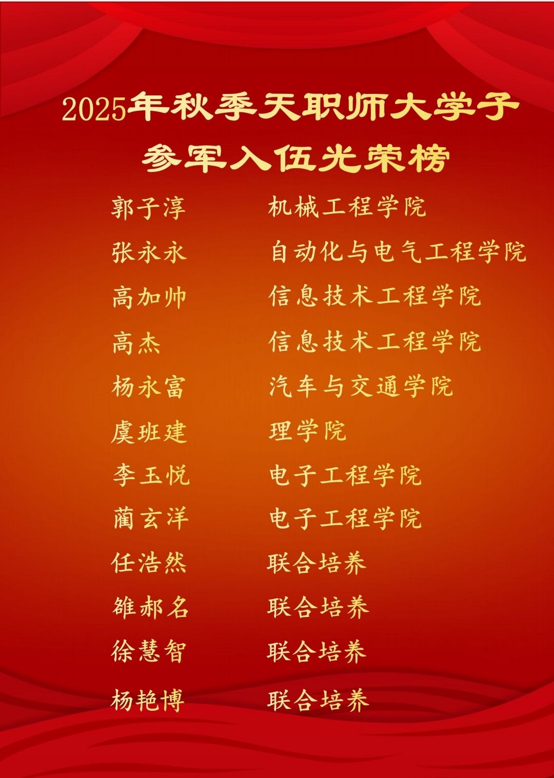 近年来,我校高度重视国防教育工作,不断创新工作方式,完善征兵工作机制。2025年,我校共有41名学子光荣入伍,在校入伍人数再创新高,展现了天职师大学子强烈的家国情怀和责任担当。下一步,学校将继续做好入伍学生的跟踪服务工作,落实各项优待政策,让学生们在部队安心服役,为强国强军事业贡献天职师大力量。