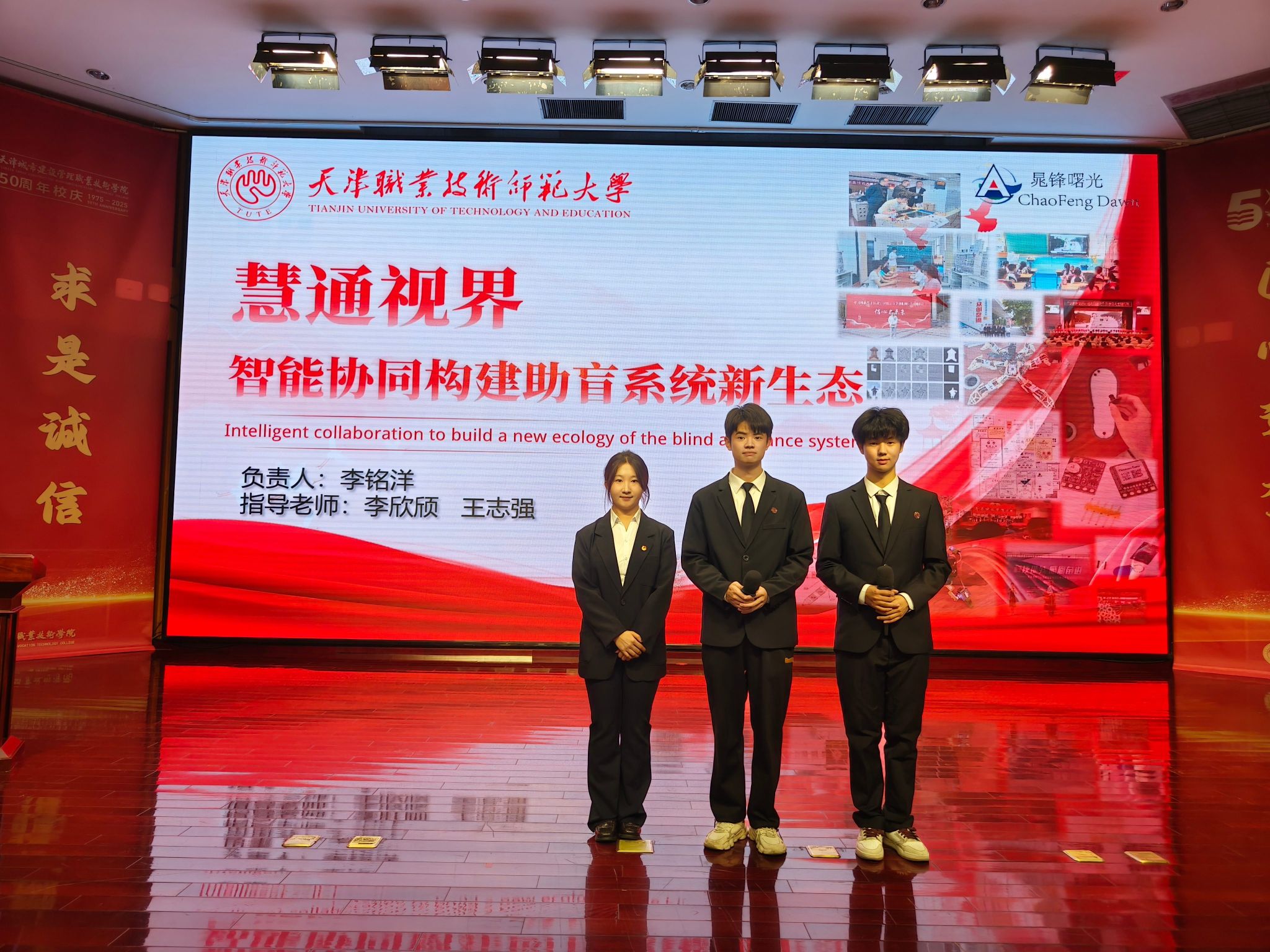 本网讯【通讯员 刘惠】11月9日上午,天津市第九届黄炎培职业教育创新创业大赛颁奖仪式在天津城市建设管理职业技术学院举行,天津市人民政府副市长、市中华职业教育社主任李文海出席活动。我校自动化与电气工程学院李铭洋团队凭借《慧通视界——智能协同构建助盲系统新生态》项目荣获本科组一等奖,并作为优秀项目代表在颁奖仪式上进行汇报展示,其创新理念与实用价值得到与会领导嘉宾的充分肯定。根据大赛安排,该项目将代表天津市参加2026年中华职业教育创新创业全国大赛。
