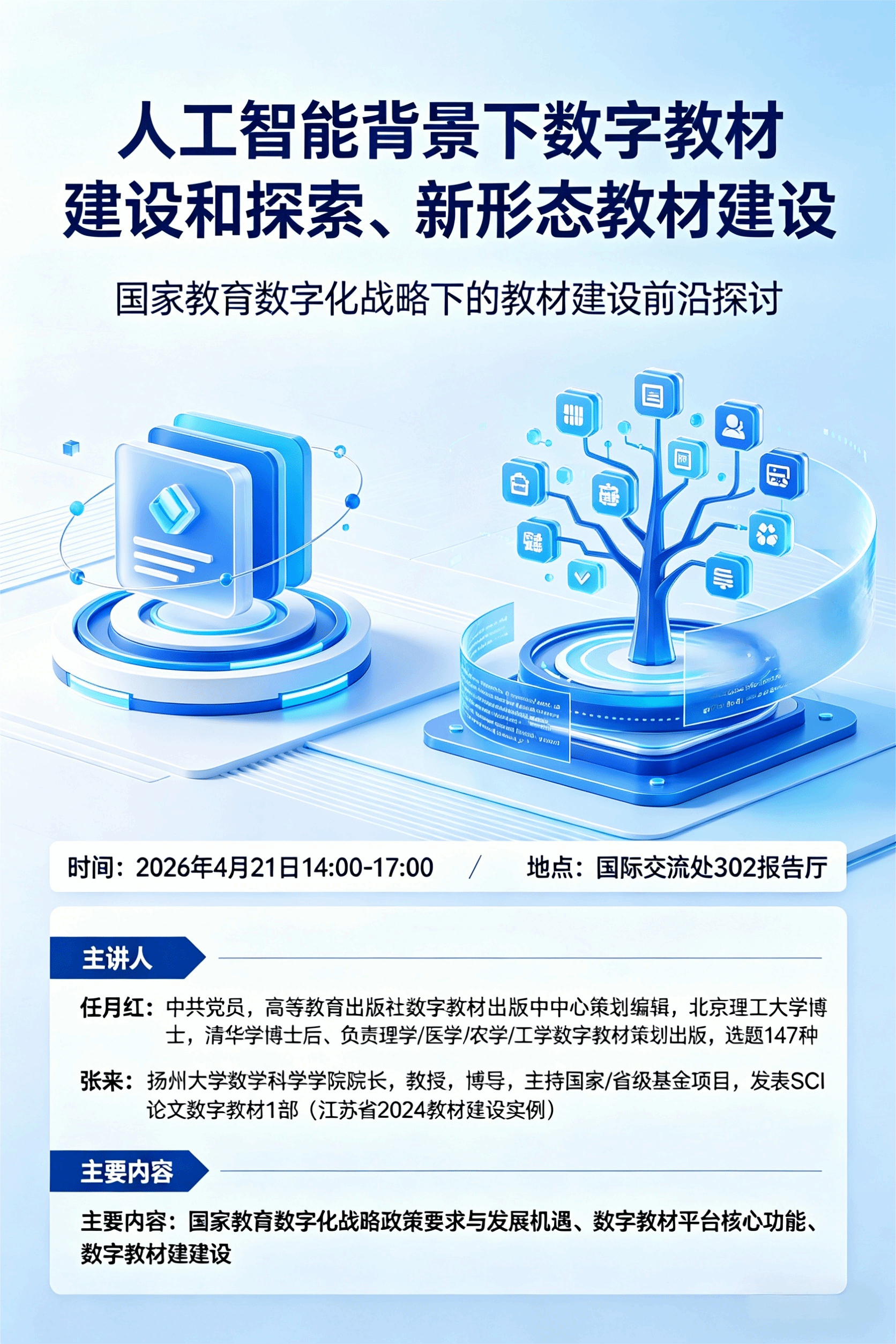本次讲座主要介绍国家教育数字化战略下数字教材建设的政策要求与发展机遇、数字教材平台的核心功能特色及数字教材建设要点、以及新形态教材建设等内容。