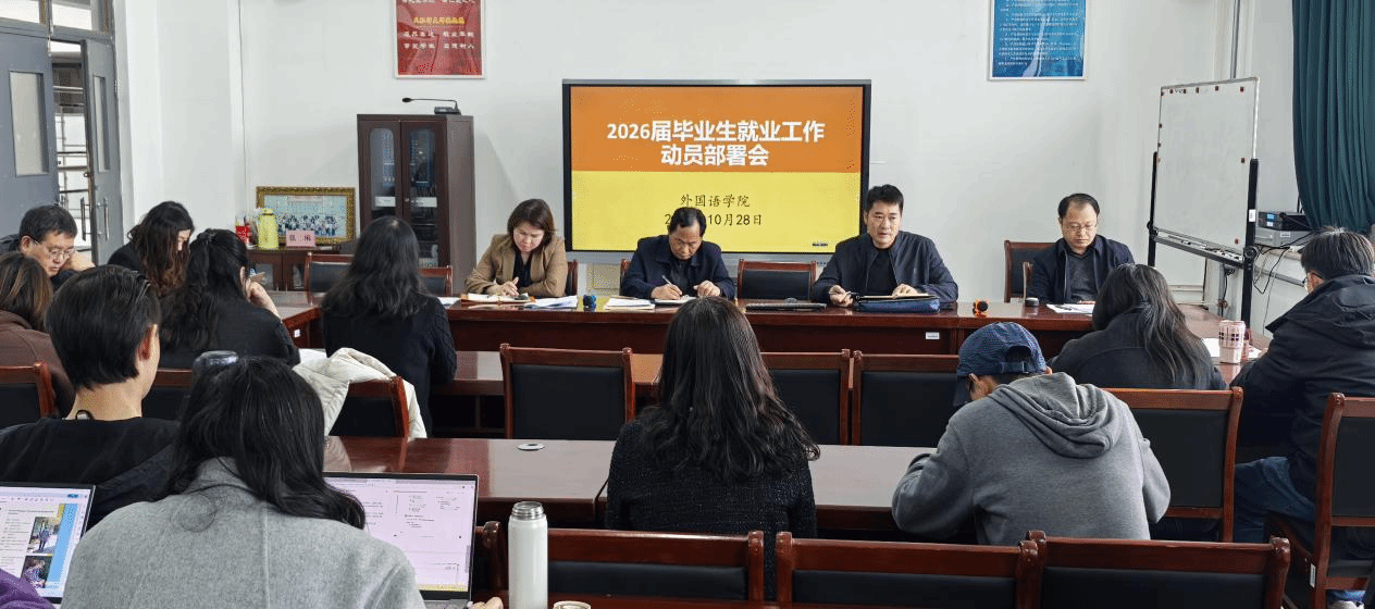 本网讯【通讯员 宋新新】为凝聚共识、压实责任,早谋划、早进入,推进学院2026届毕业生就业工作,10月28日,外国语学院召开2026届毕业生就业工作动员部署会。全体院领导、系主任、毕业班研究生导师、班主任、辅导员参加,会议由院党委副书记李刚主持。