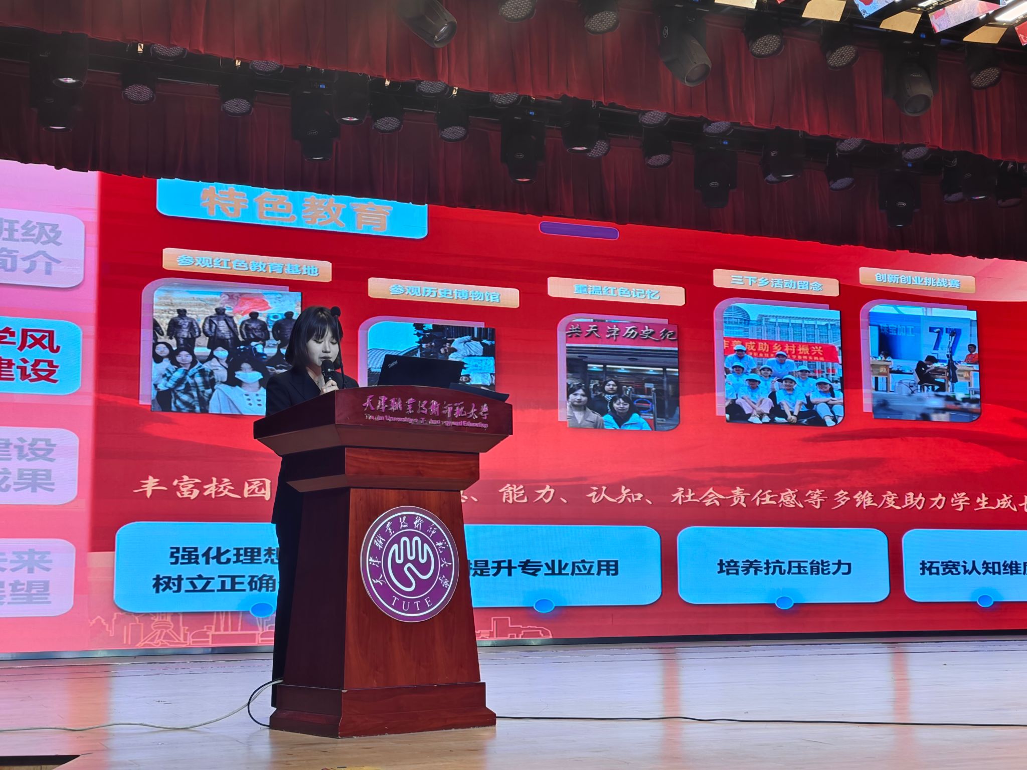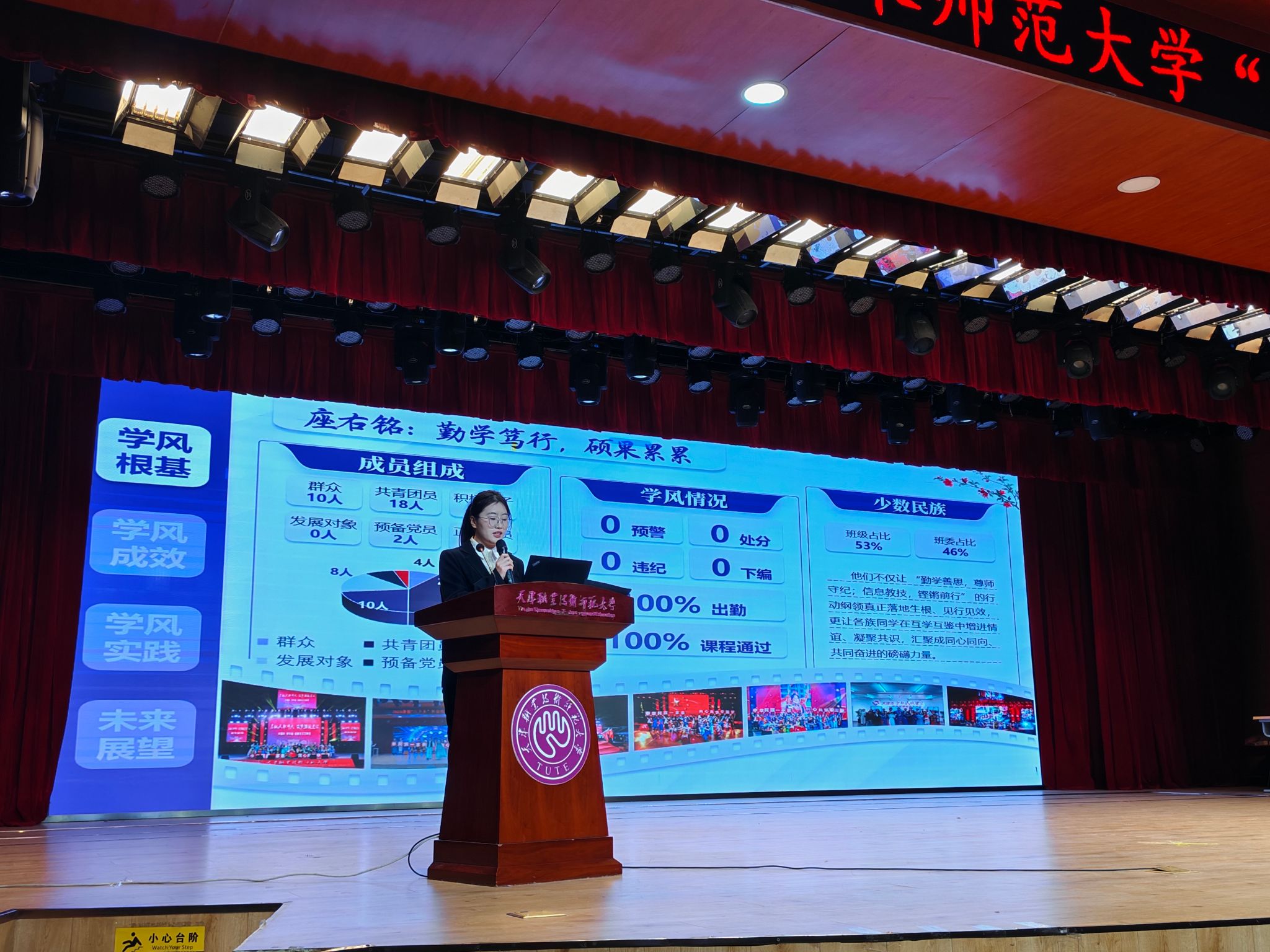 机械工程学院机制2211班以“思想领行、勤学笃行、科研拓行、聚力前行”四个方面讲述班级扎根专业、共赴理想的学风建设实践;艺术学院珠宝2301班组织开展艺术研学活动,带领班级同学用艺术家的眼光去发现生活中的美并展现在创作中;外国语学院日语2301班开展“听力强化月”“口语提升月”“阅读挑战月”等专项学习提升计划,35%的同学在年级综测排名中获得进步……各班级以生动的案例、翔实的数据、成长的故事,呈现出班级在制度规范、活动激励、文化浸润等方面的创新实践,向我们展示了优良学风的丰富内涵与生动实践。校级“优良学风班”计科2113班学生李亚雪表示,将以此次展示为新起点,让勤奋学习成为自觉行动,让互助共进成为班级常态,让创新探索成为不懈的追求。