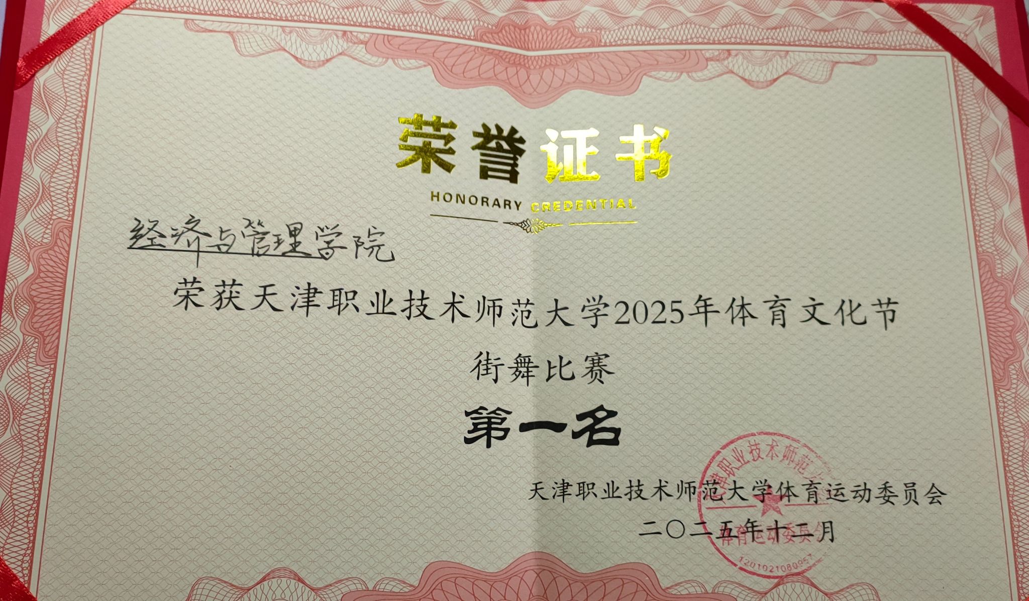 本网讯【通讯员 刘欣宇】12月11日,我校2025年度体育文化节系列活动之街舞比赛在体育馆燃情落幕。经济与管理学院街舞队凭借精准有力的动作、默契十足的配合与富有感染力的舞台表现,从全校八支参赛队伍中脱颖而出,成功斩获街舞比赛一等奖,为学院在本届体育文化节的征程画上了圆满的句号。